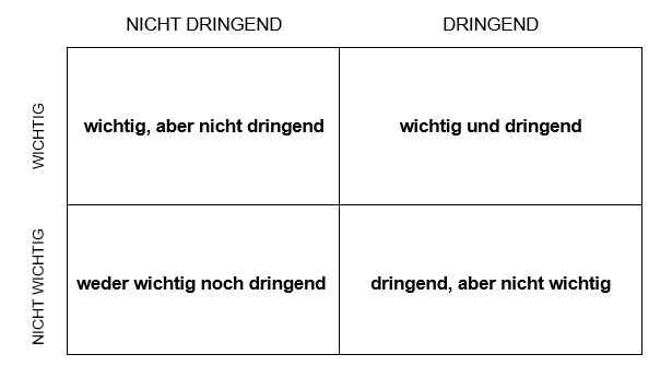 Die sogenannte Eisenhower-Matrix eignet sich gut dafür. Sie unterscheidet zwischen ‘Wichtigem’ und ‘Dringendem’.
